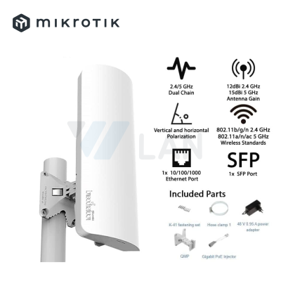 SXTsq 5 ac with 16dBi 5GHz antenna, Dual Chain 802.11ac wireless, 716MHz CPU, 256MB RAM, 1 x Gigabit LAN, POE, PSU, pole mount, RouterOS L3